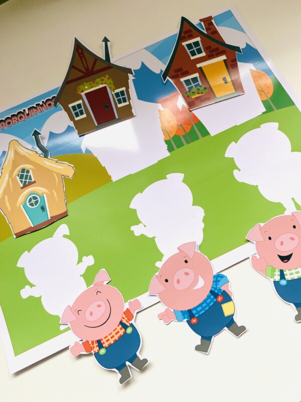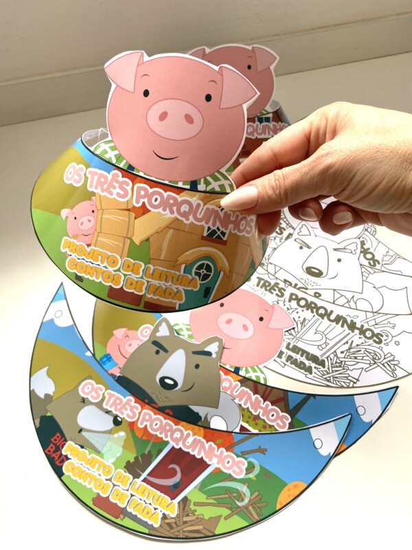 Com os três porquinhos e o lobo mau, ideais para dramatizações e contações criativas.