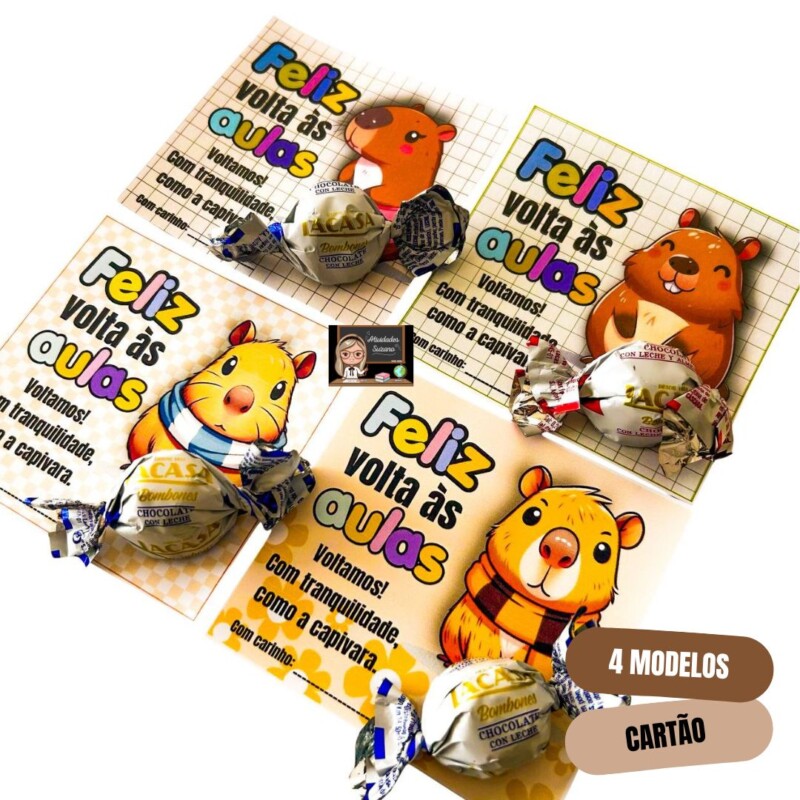 4 Modelos Diferentes: Artes variadas com capivaras fofas e a frase: “Voltamos! Com tranquilidade, como a capivara”.