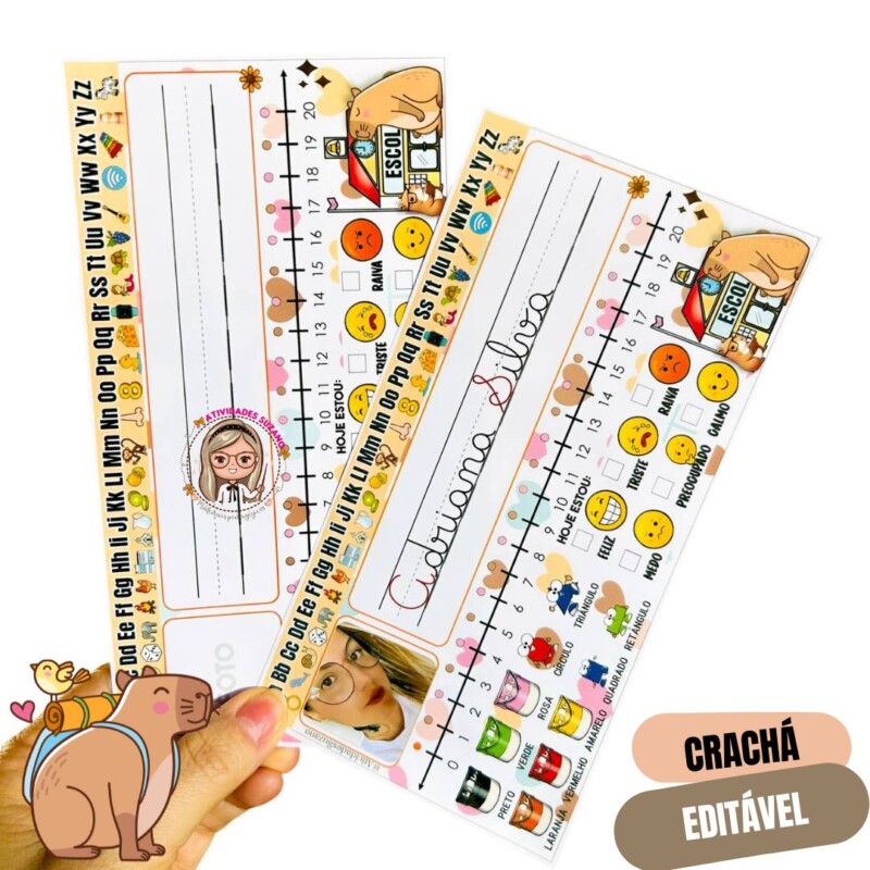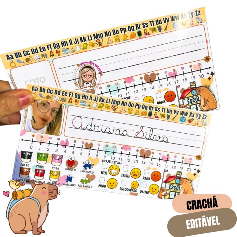 Organização e Aprendizado: Além de identificar as carteiras, o crachá funciona como um material de consulta instantâneo, apoiando o aluno em dúvidas de escrita e matemática básica ao longo do dia.