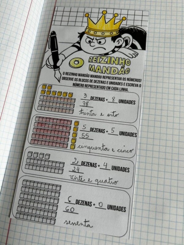 Atividades de raciocínio lógico e operações matemáticas, todas com o tema do Reizinho Mandão, tornando a aprendizagem divertida e contextualizada.